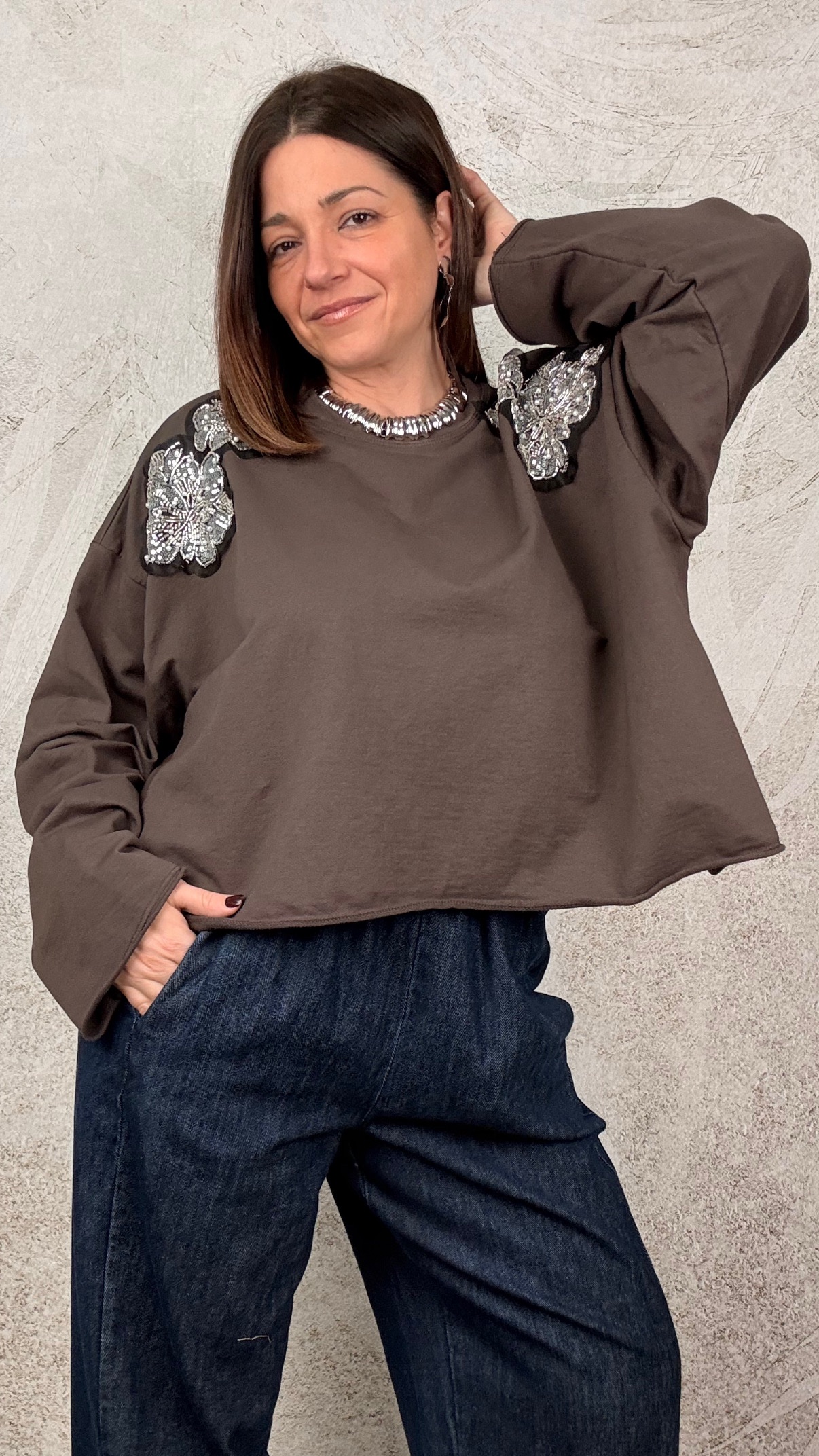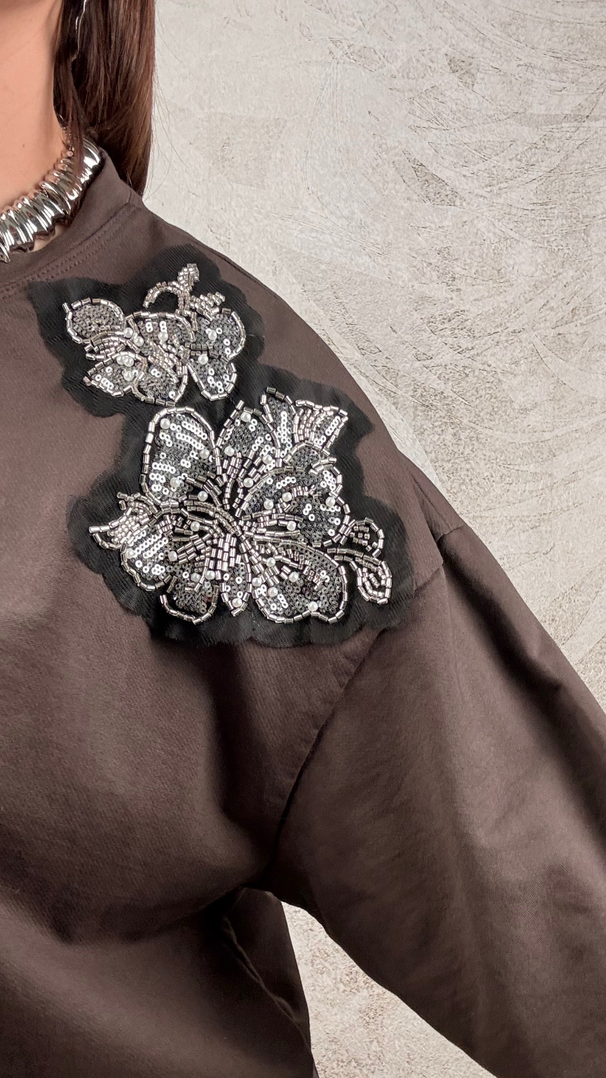 Blusa girocollo con applicazioni di strass e perline sulle spalle