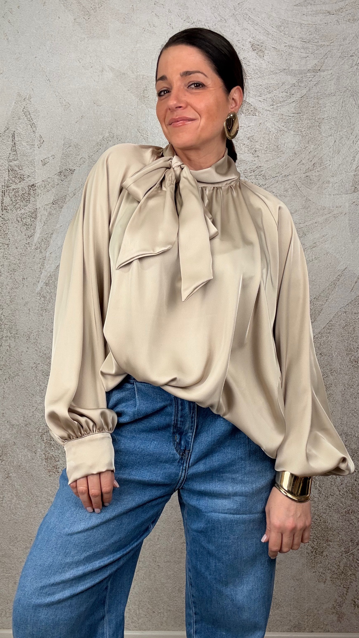 Camicia con fiocco laterale sul collo e manica a palloncino