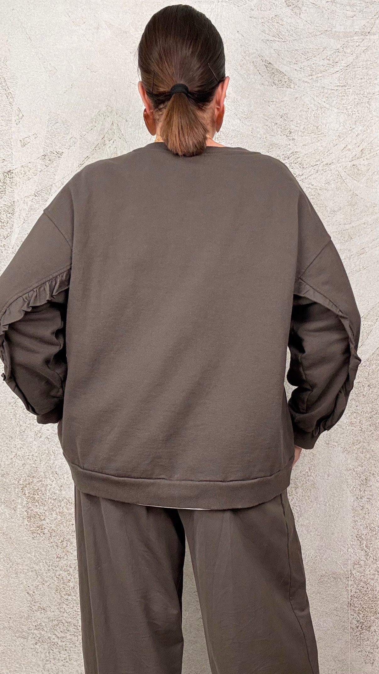 Completo composto da felpa con balza sulla manica e pantalone con elastico in vita e tasche laterali