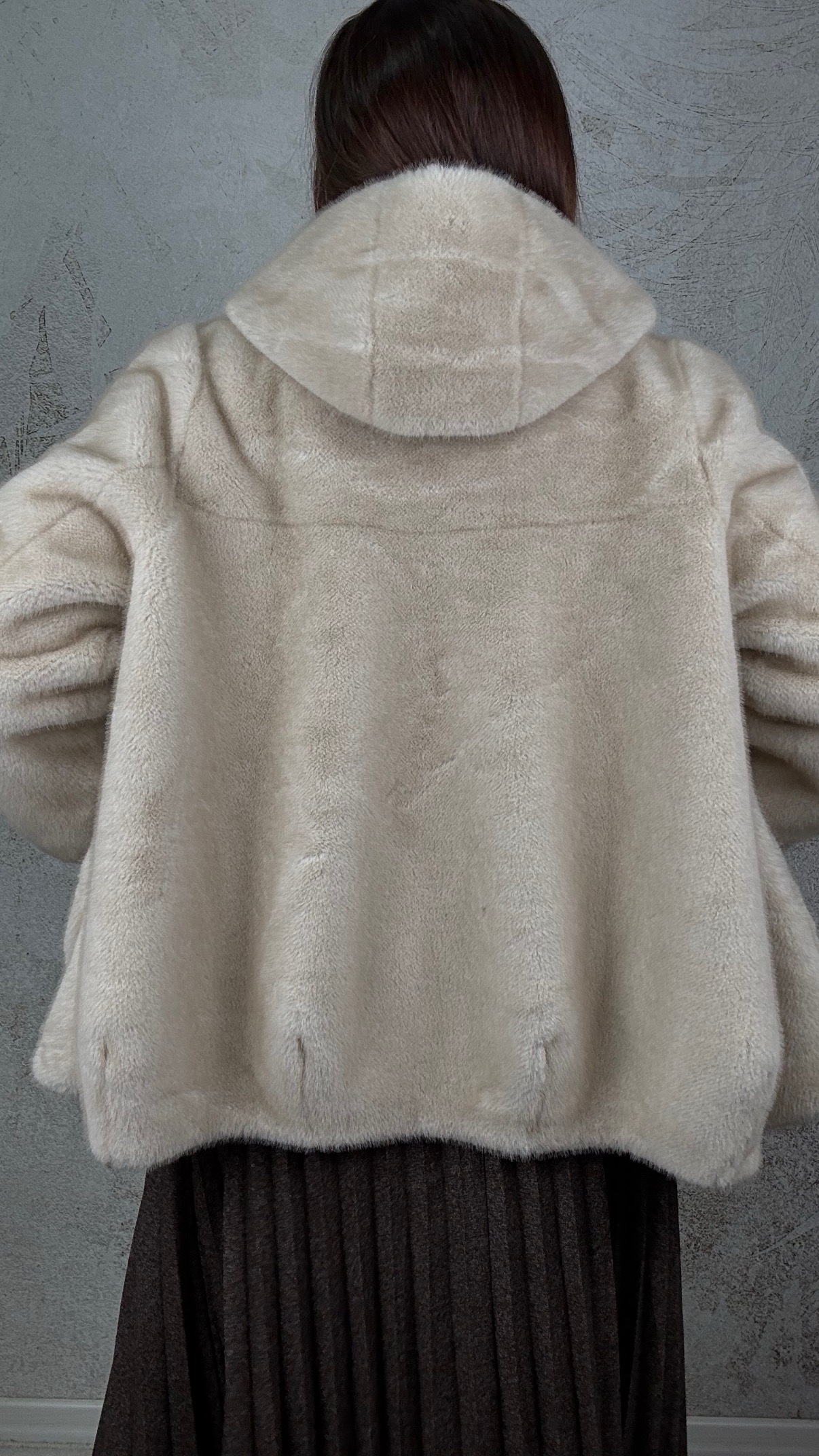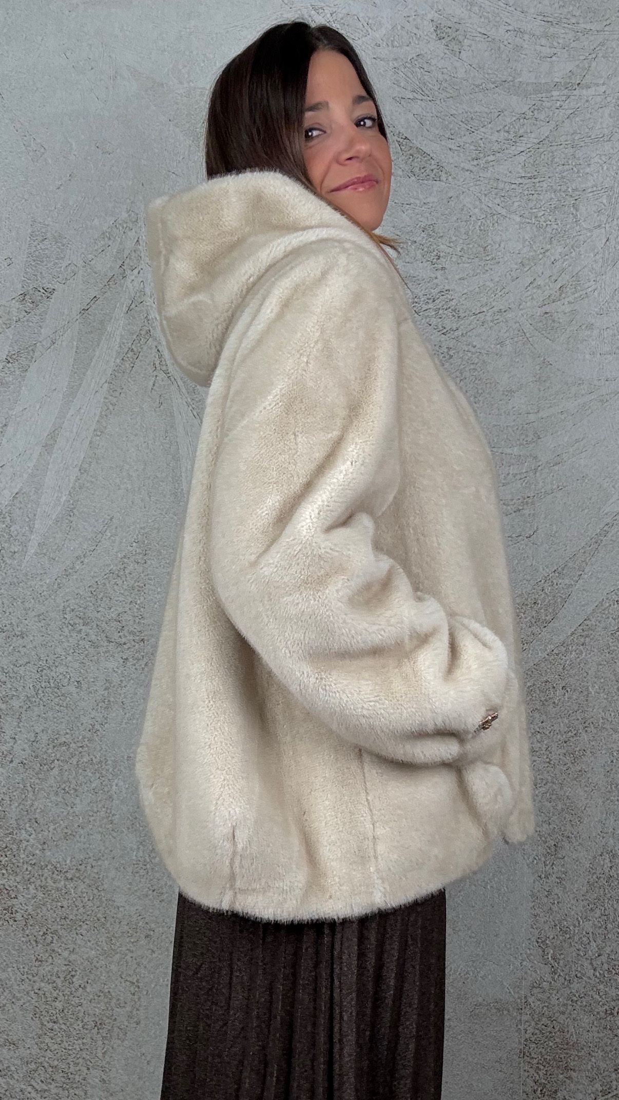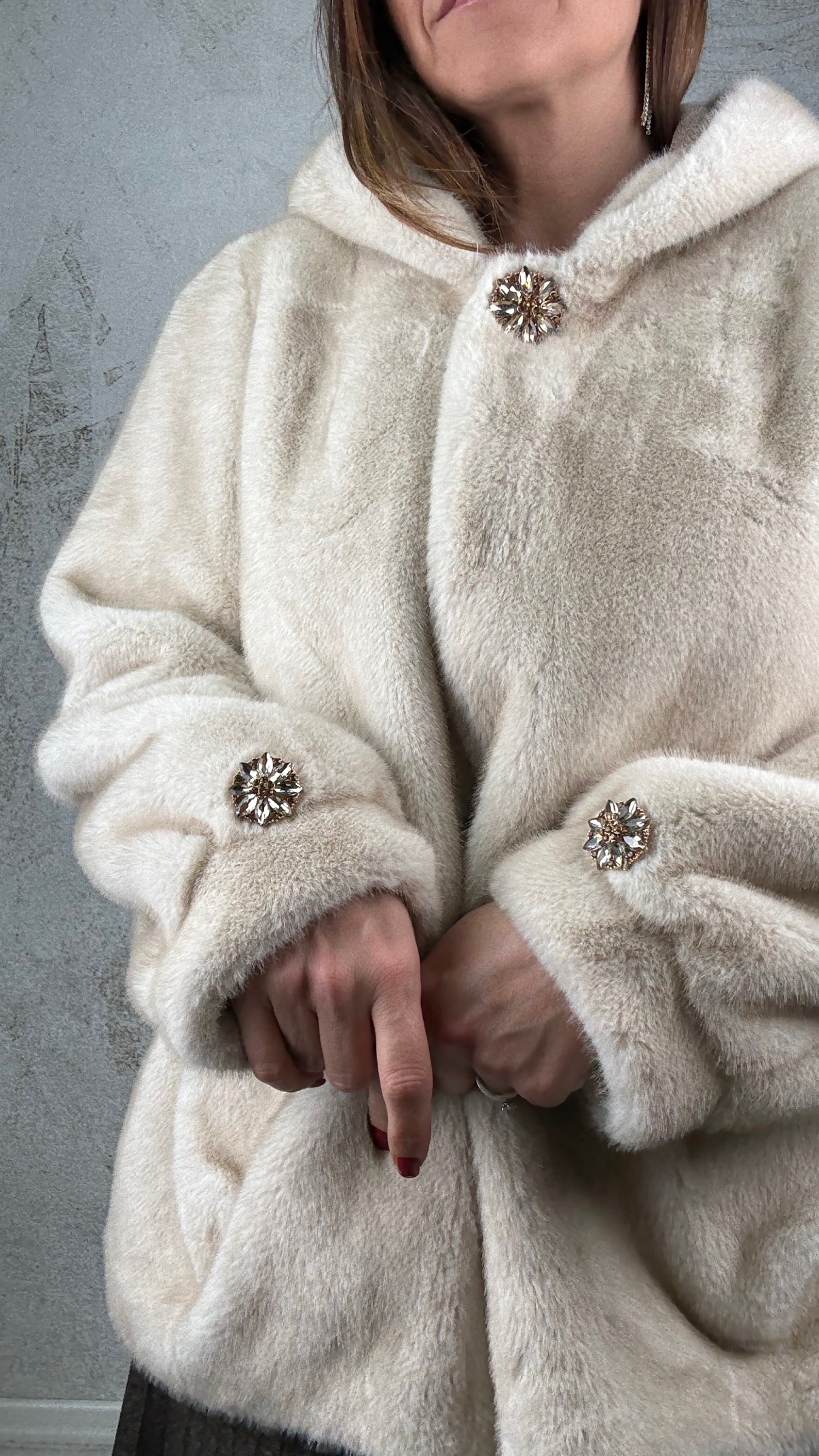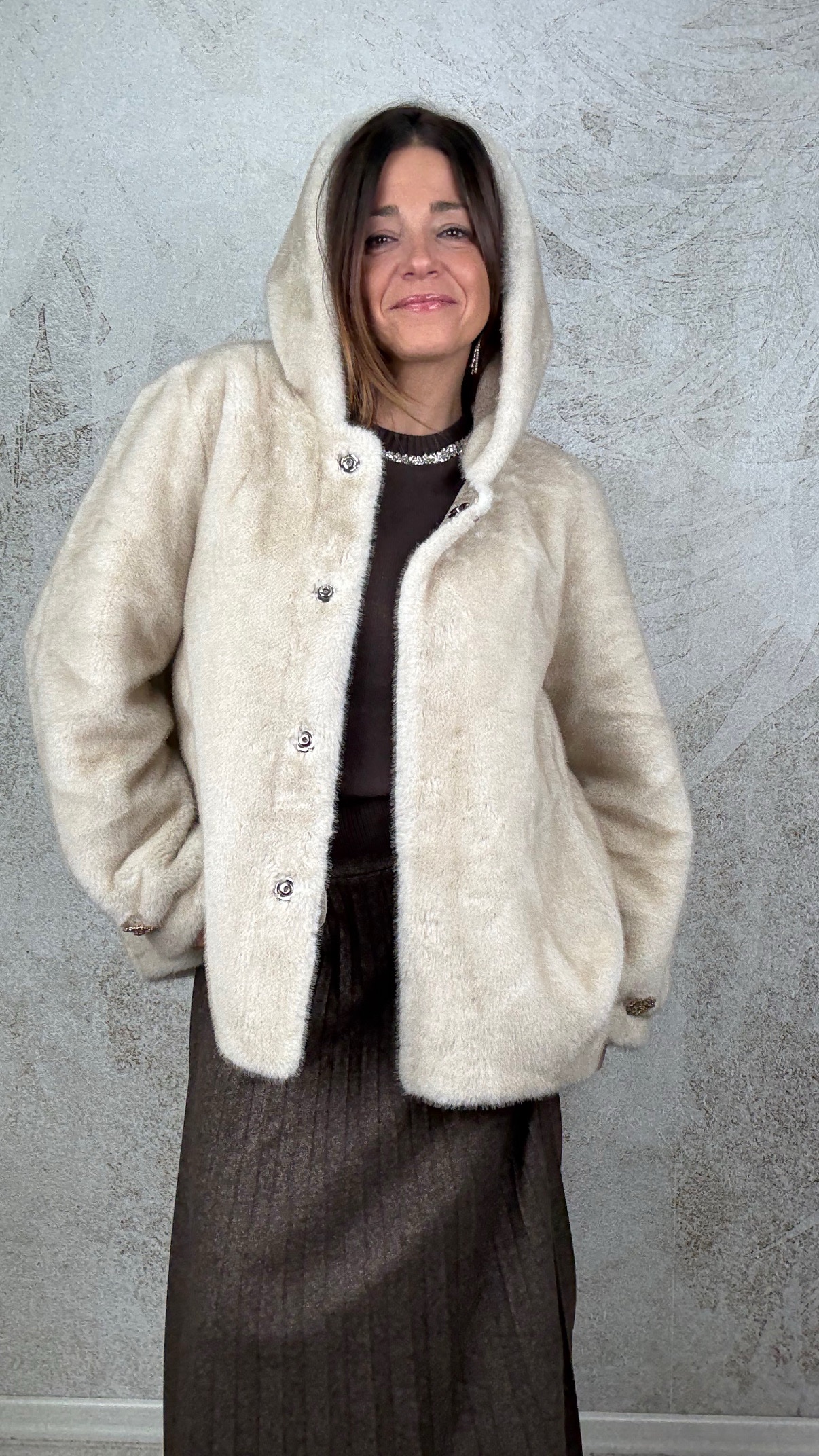 Eco pelliccia con bottoni gioiello, tasche laterali e cappuccio