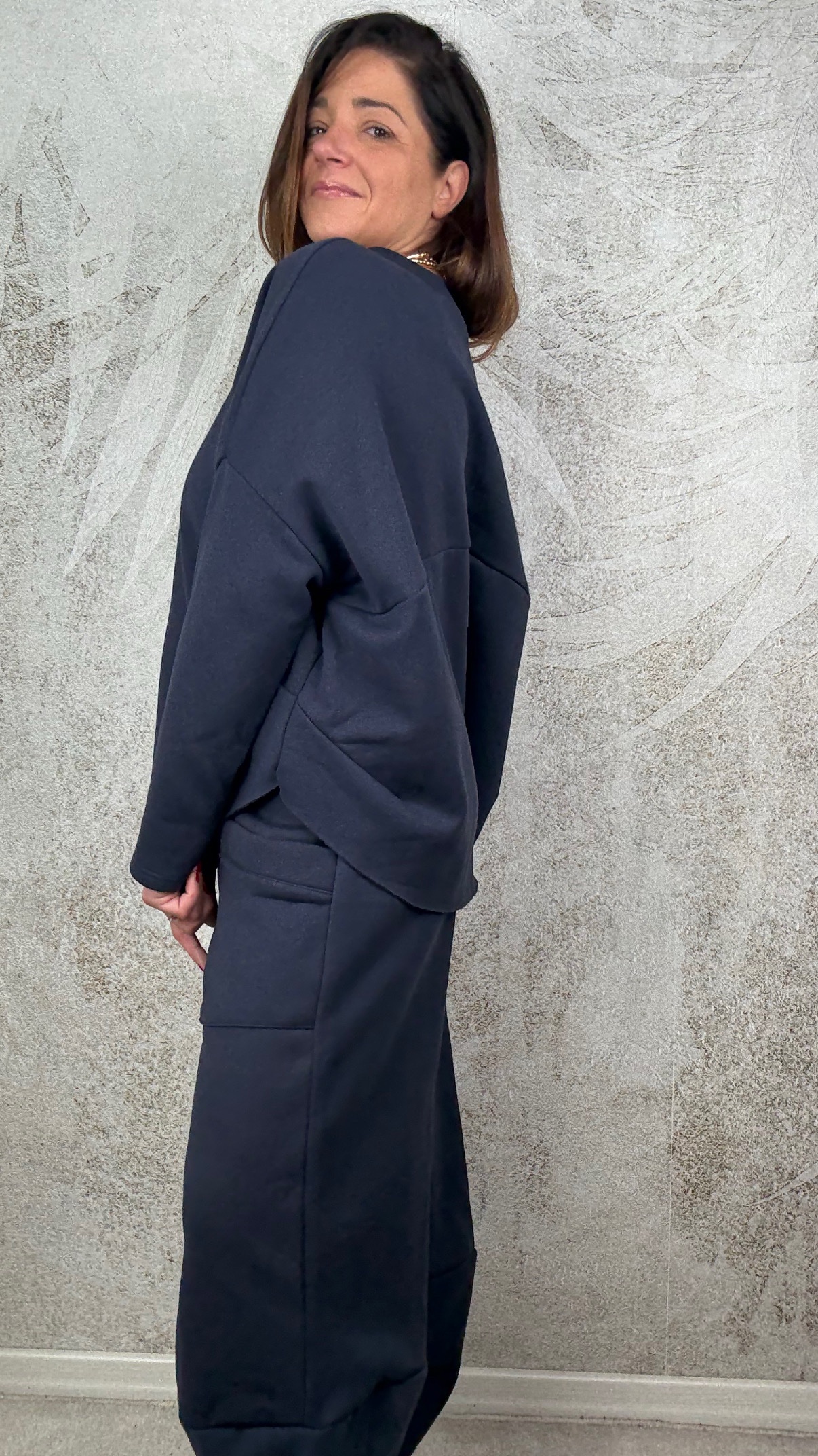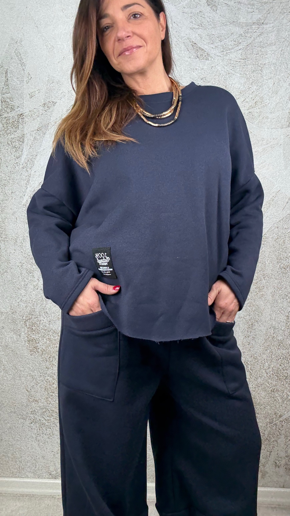 Completo felpato internamente composto da blusa over e pantalone con elastico in vita e tasche frontali